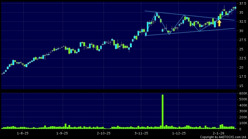 Triangle Breakout means the volatility of price movement is decreasing, stock price finally broke the top of triangle. An upward trend will start.(HK stocks quote is delayed for at least 15 mins.Short Selling Data as at 2026-01-15 16:25.)