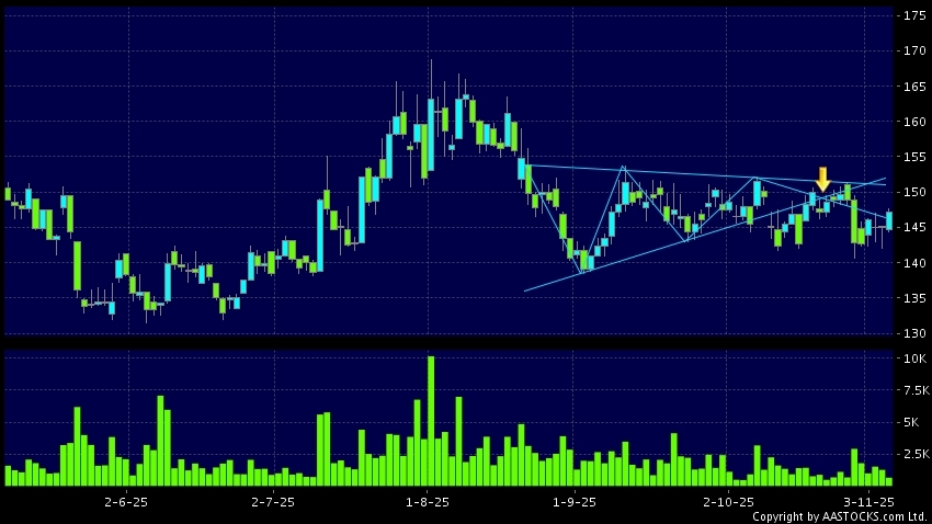 Triangle Breakout means the volatility of price movement is decreasing, stock price finally broke the bottom of triangle. A downward trend will start.(HK stocks quote is delayed for at least 15 mins.Short Selling Data as at 2025-11-06 12:25.)