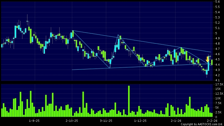 Triangle Breakout means the volatility of price movement is decreasing, stock price finally broke the bottom of triangle. A downward trend will start.(HK stocks quote is delayed for at least 15 mins.Short Selling Data as at 2026-02-04 16:25.)