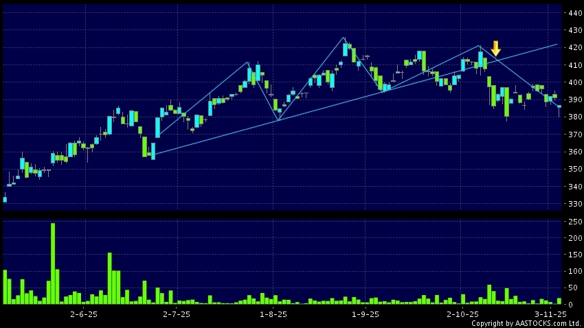 HKEX-R(80388.HK)  -3.000 (-0.767%)    Short selling $3.04M; Ratio 42.246%   appears a downside breakout, dropped below the neckline. Last printed at 386.200; fell 1.278%; on volume of 18.90K shares and turnover of $7.20M