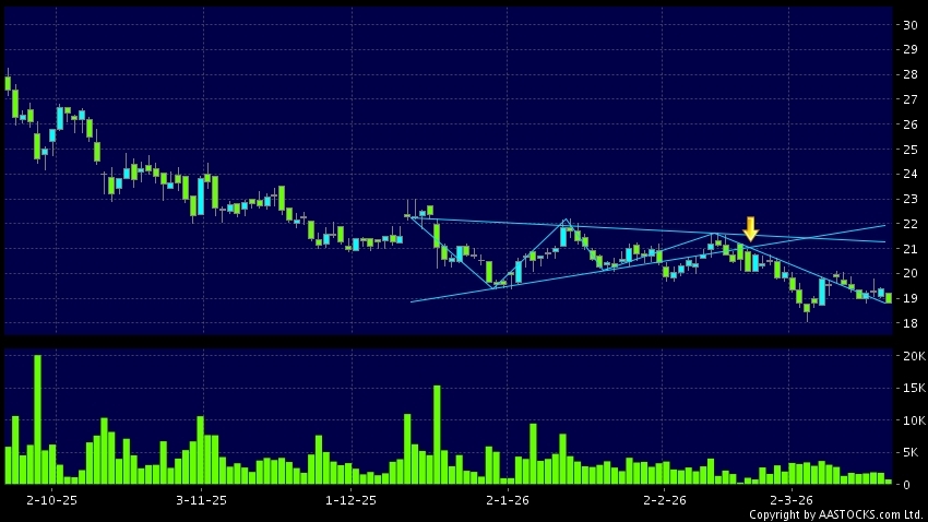 三角形向下突破是指股价的波幅渐渐收窄,在图表上形成三角形般的状态。股价在三角形的末端向下突破,下跌趋势形成,技术走势偏软。(港股报价延迟最少十五分钟。沽空资料截至 2026-03-24 16:25。)